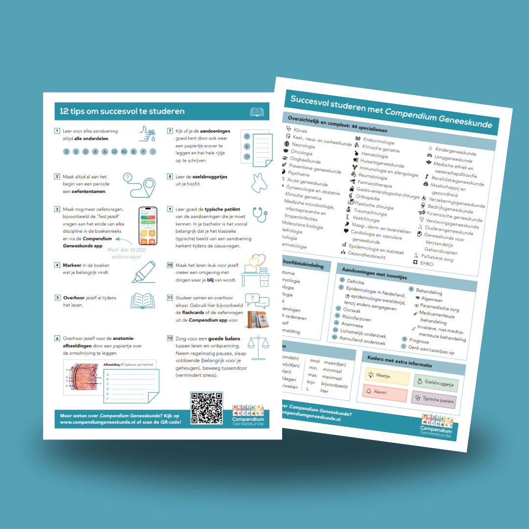 "Zoek uit wat qua studiemethodes en leren goed voor jou werkt en bekijk dit echt per vak. Voor de leerlijn MGZ is het vaak behoorlijk stampwerk en moet je veel over een onderwerp overzichtelijk paraat hebben. Vraag jezelf: wil je alles het liefst uit boeken leren of studeer je beter door colleges terug te kijken? Ik merkte voor mijzelf dat de kracht vooral in herhaling van studiestof leek te zitten. De reeks van Compendium vind ik hiervoor nog steeds ideaal, want ook nu tegen het eind van mijn studie aan gebruik ik het nog regelmatig als ik meer overzicht wil en alles centraal op een plek wil kunnen vinden."