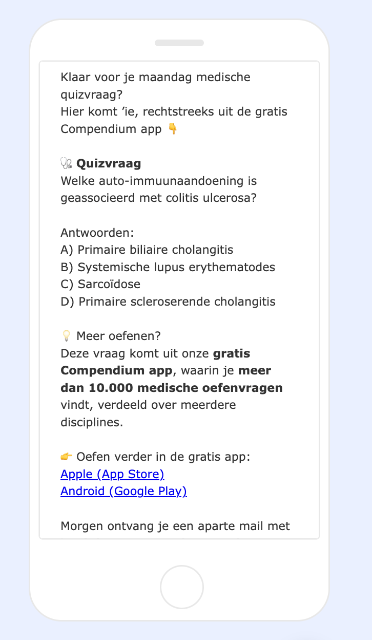 Wil jij wekelijks op maandag de Medische Maandag quizvraag ontvangen? Schrijf je dan hieronder in! De vragen komen uit de gratis Compendium App database met meer dan 10.000 vragen. Op dinsdag ontvang je een e-mail met het antwoord.