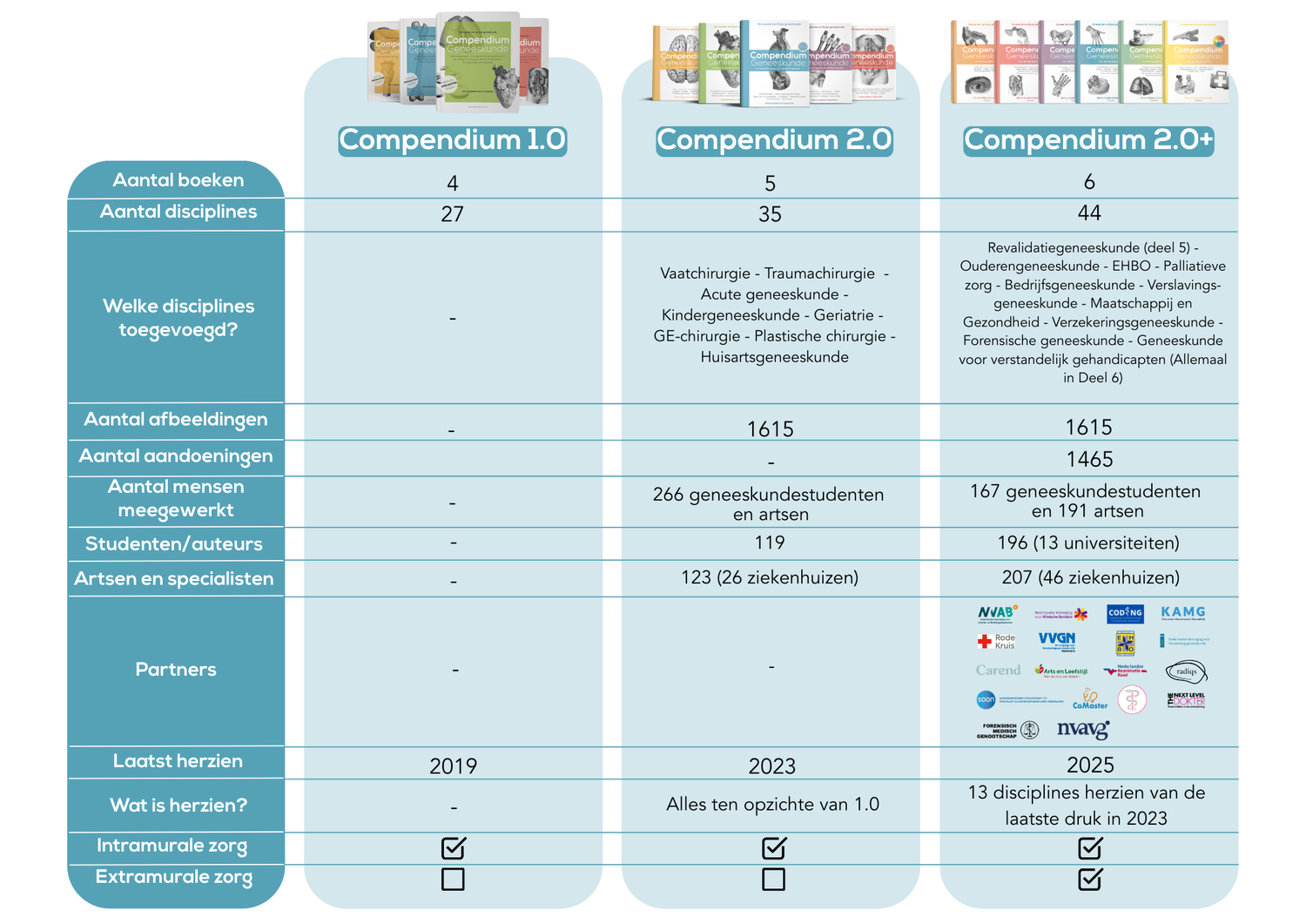 In de tabel vind je de verschillen tussen Compendium 1.0, 2.0 en onze nieuwste editie: Compendium 2.0+.